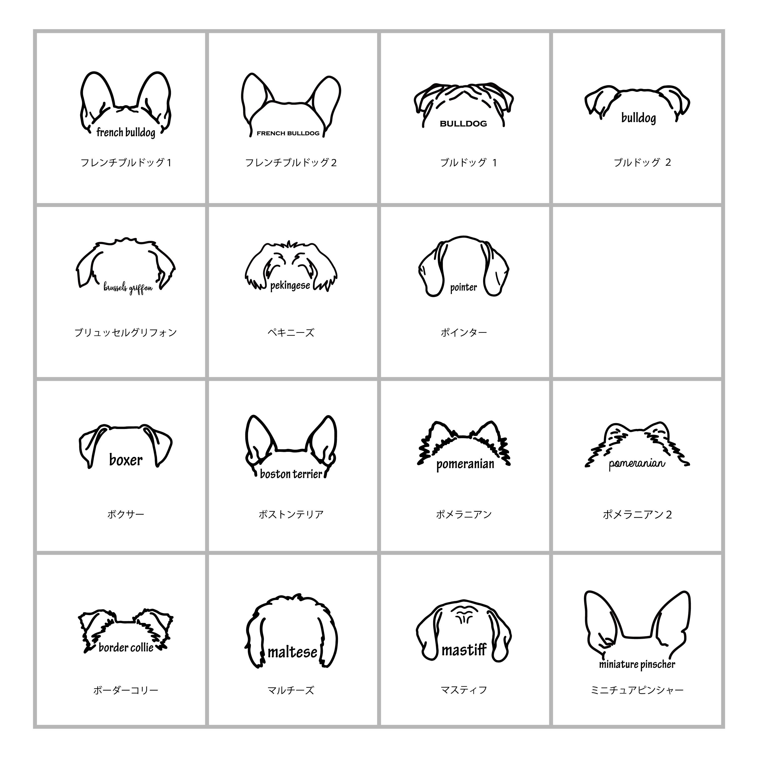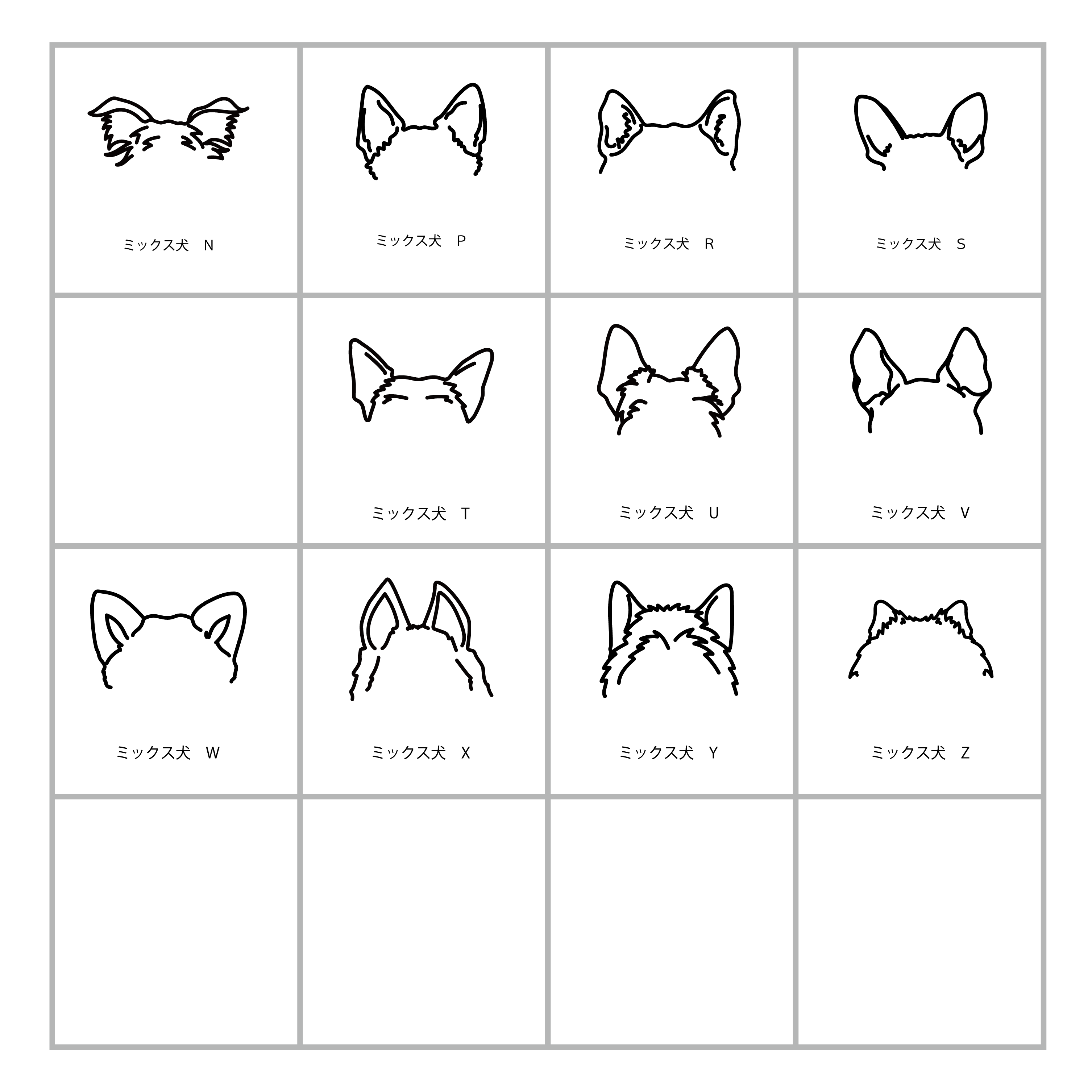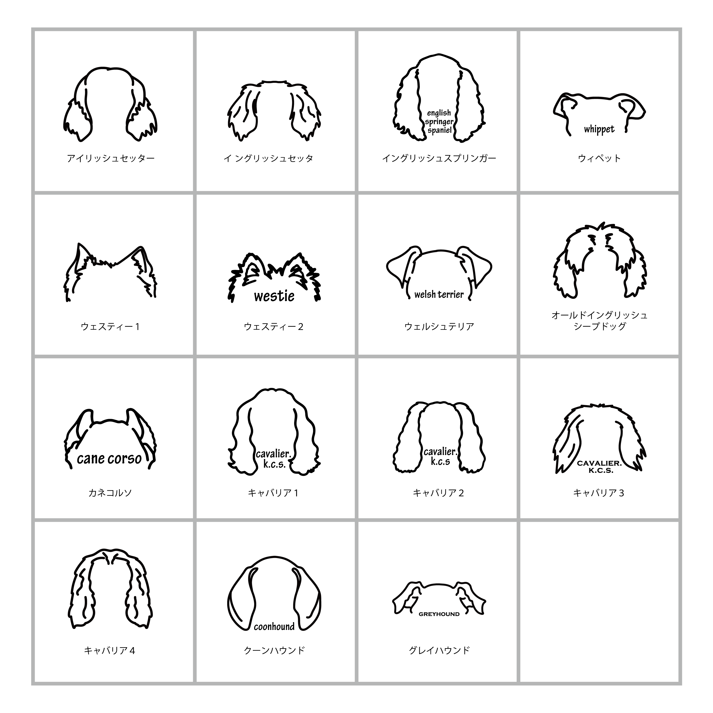 webショップ掲載のお耳一覧の中から、うちの子のお耳に一番似ているシルエットをお選びください。