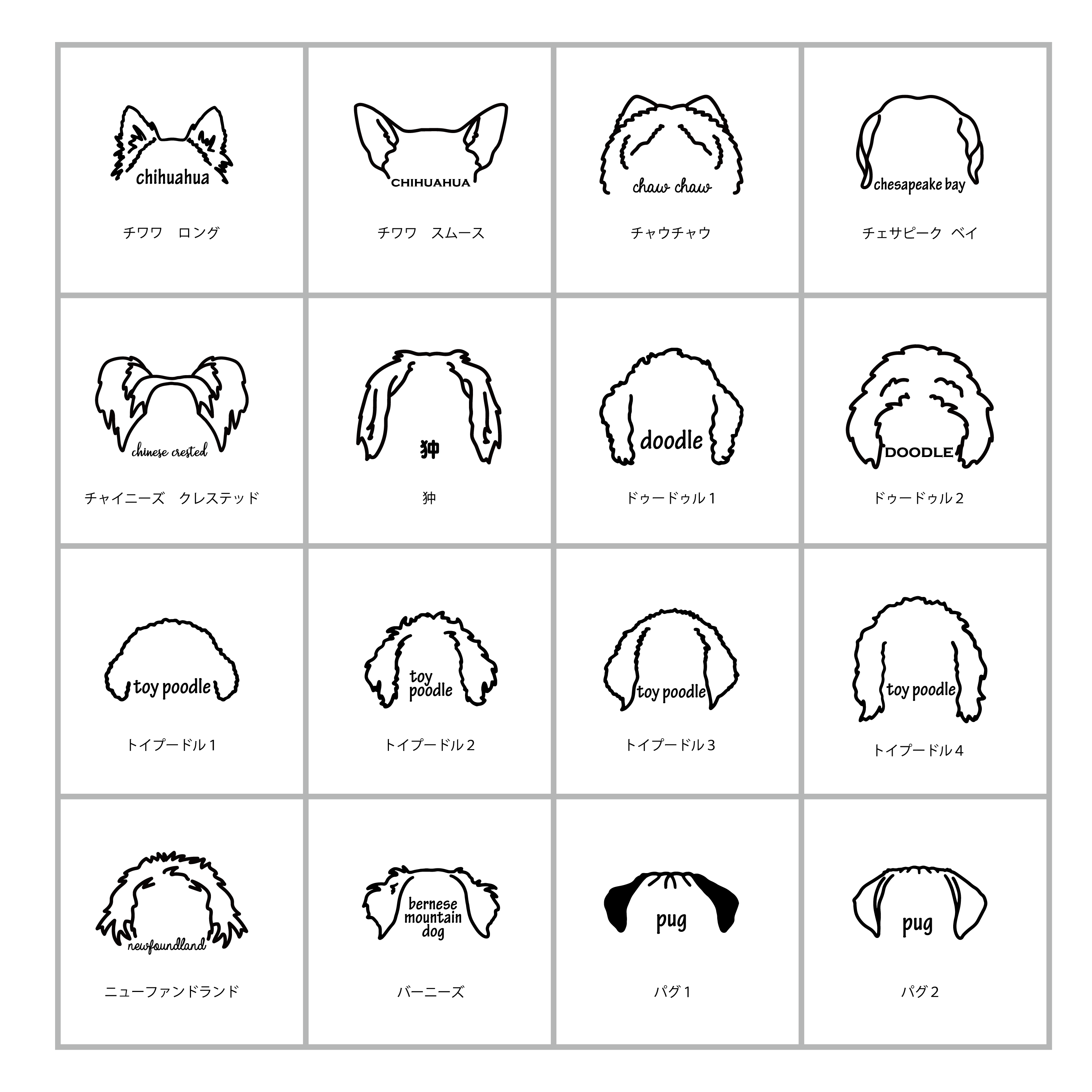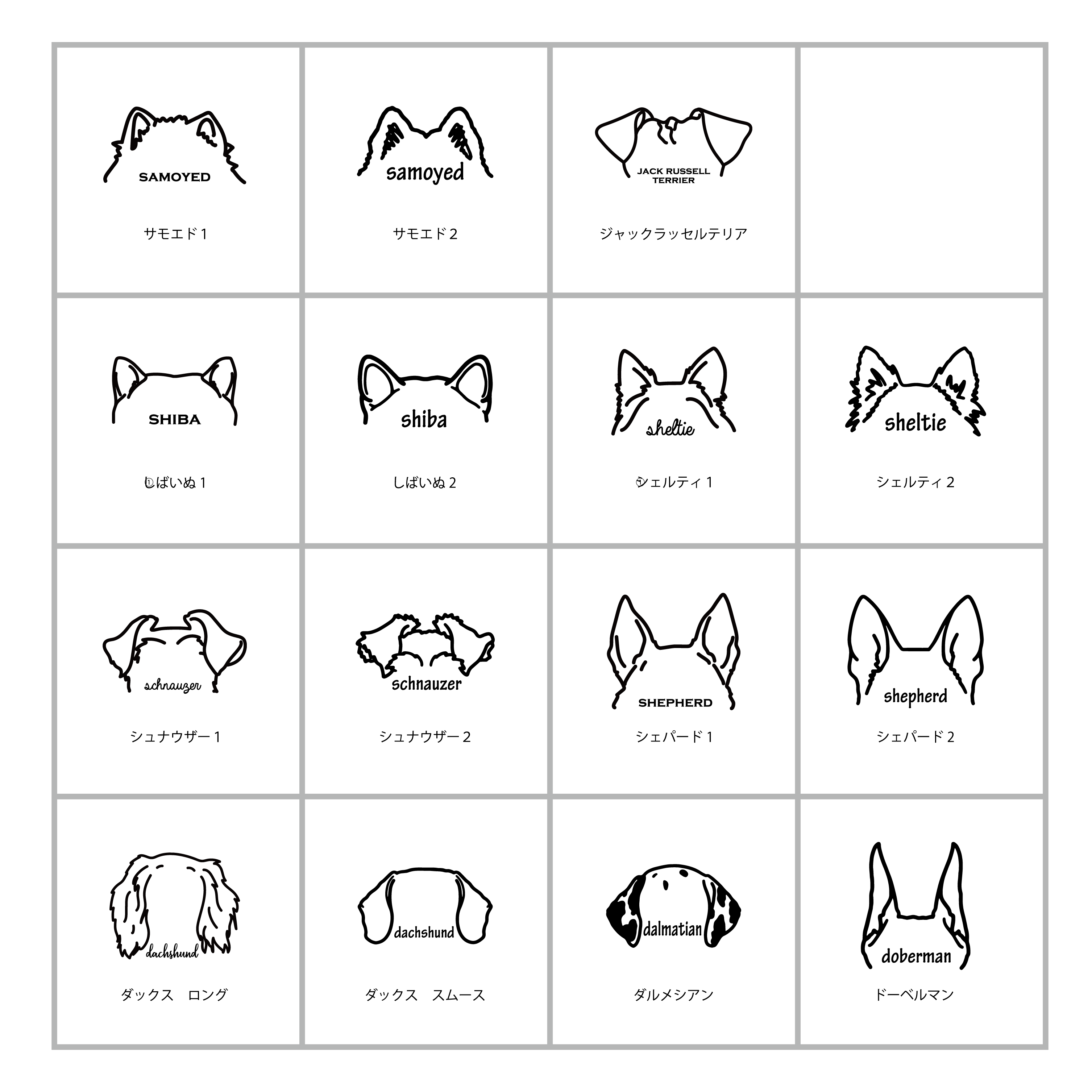 お耳シルエットは2つまでお入れできます。(2匹の場合は犬種名がとても小さくなってしまうため、犬種名が入りません。すっきりしていておすすめです。)
